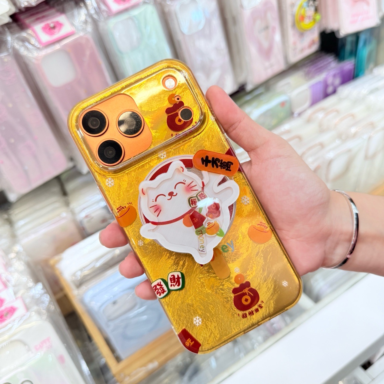Case Ốp điện thoại iPhone Mèo May Mắn & Túi Tiền Money Tài lộc Ánh Xà Cừ Magsafe Vàng iPhone 13/14/15/16/17Pro/Promax